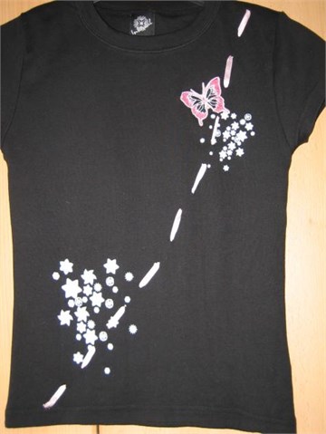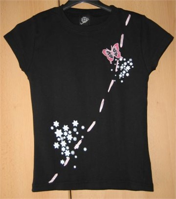 Preslatka majica crne boje, kratkih rukava. Na prednjoj strani majice print i našivene aplikacije u rozoj i bijeloj boji, kroz majicu ušivena sjajna trakica blijedo roze boje. Izuzetno mekan i rastezljiv pamuk.