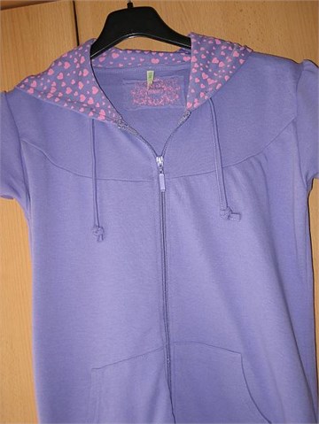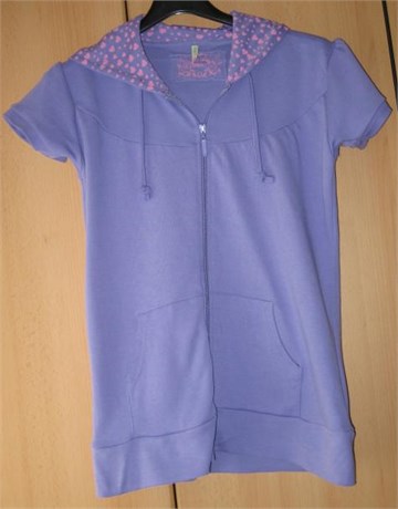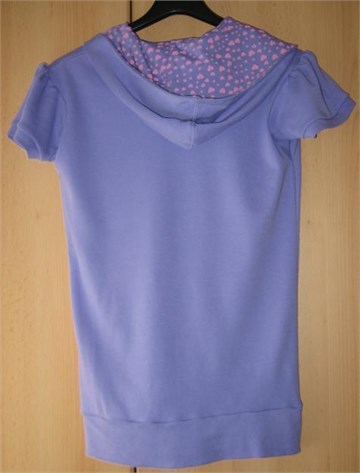 Preslatka majica na cif, kratki rukavi. Sa unutarnje strane kapuljače print rozih srčeka.  Prednji džepovi, blagi puf rukaviči. Vrlo lagan i rastezljiv pamuk.