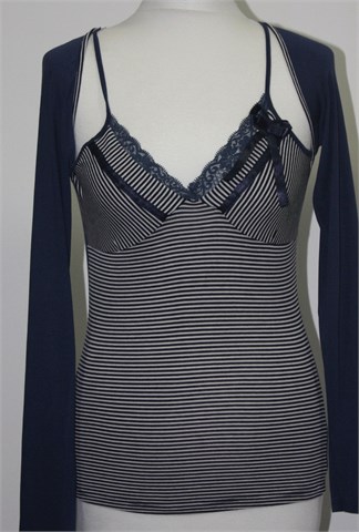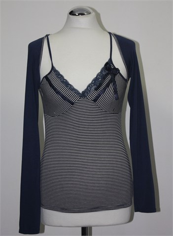 Majica sa dugim rukavima, dvoslojnog izgleda (2u1 topić i bolero-majica). Rukavi i stražnji dio plave boje, ušiveni prugasti topić u kombinaciji plave i bijele boje sa ukrasnom čipkicom i satenskim trakicama i mašnicom. Mekan i vrlo rastezljiv materijal.
