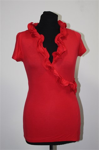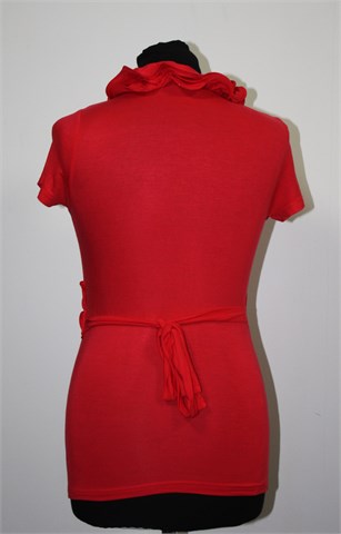 Majica sa kratkim rukavima, ugodne crvene boje (nešto zagasitija nijansa nego na slici). Sa prednje strane fiksni preklop ukrašen volančićima. Bočne vezice - vežu se sa stražnje strane. Materijal je dupli sa prednje strane. Mekana i vrlo rastezljiva.