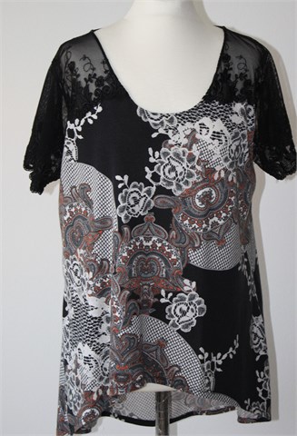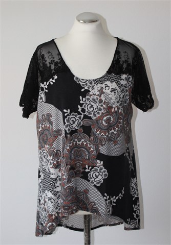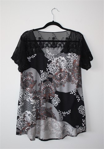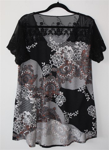 Šivana i unikatna majica/tunika sa kratkim rukavima crne boje sa printom i detaljima od čipkastog tila (vidljivo na slikama). Duža sa stražnje strane (vidjeti mjere). Mekana i rastezljiva.