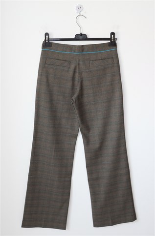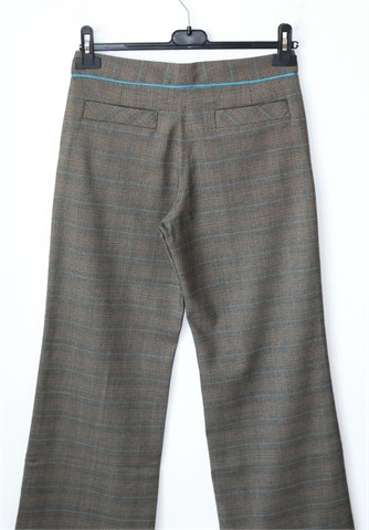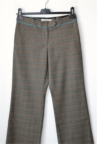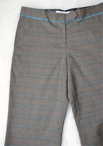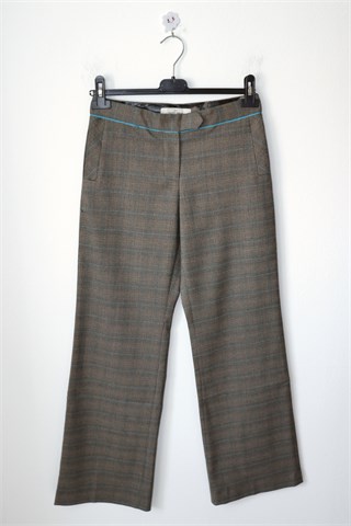 Malene Birger hlače od štofa, smeđe-bež boje sa uzorkom, mjestimično detalji u tirkiznoj boji (vidljivo na slikama). Prednji cif i kopčanje, bočni džepovi, stražnji skriveni džepovi (još uvijek zašiveni). Tanji štof, jako kvalitetne. Blago rastezljive.