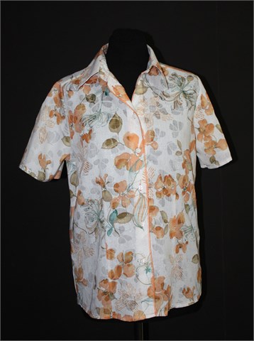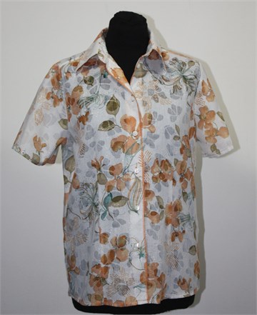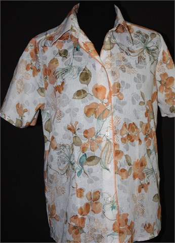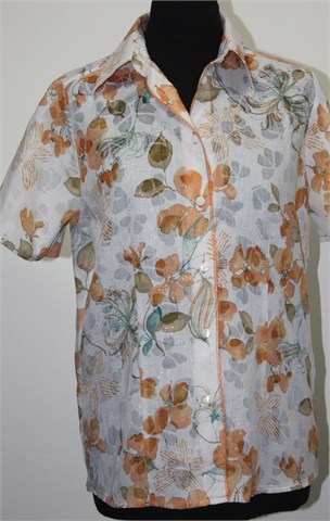 Malva košulja sa kratkim rukavima, bijele boje sa cvjetnim printom i mjestimičnim šljokavim točkicama. Prednje kopčanje, blago strukirana. Tanja, lagana i blago providna. Nije rastezljiva.