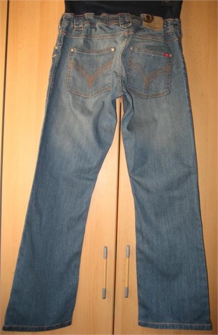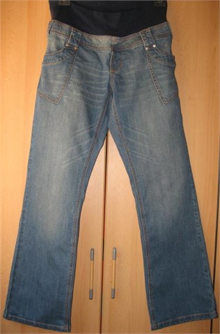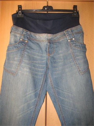 Nove, samo oprane. Dio za trubuh tamno plave boje. Ukrasi na trapericama od narančastog konca. Ravne i malo šire nogavice. Prednji i stražnji džepovi, pasica za remen. Blago rastezljive. Iza dublje, naprijed pliće, naravno sa rastezljivim umetkom za trbuh. Super stoje, vrlo moderne. Na hlačama piše veličina 31.