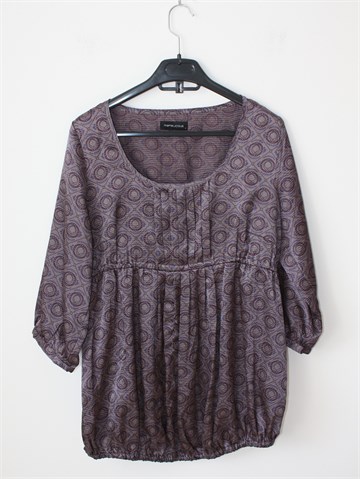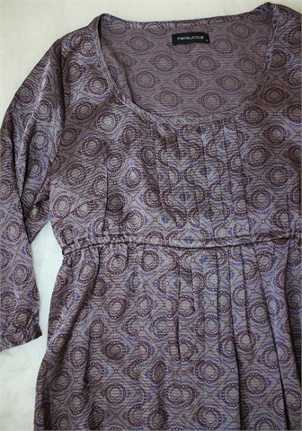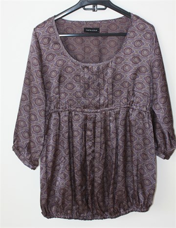 Mama.licious bluza sa poludugim rukavima, ljubičasto-sive boje sa printom (boje i uzorak printa vidljivi na slikama). Gumica ispod prsiju i na pasici, ukrasni prošivi sa prednje strane. Tanja i lagana, blago rastezljiva. Duža sa prednje strane.