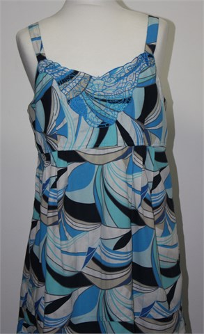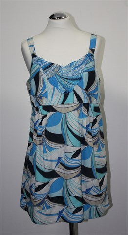 Mana duža bluza/topić bijele boje sa šarenim, većinom plavim printom. Fiksne naramenice, prošivena gumicama na leđima. Ukrasni prošivi od konca sa prednje strane (na dekolteu se mrvicu odšio končić ali nije jako vidljivo). Lagana i prozračna, podstavljena u gornjem dijelu.
