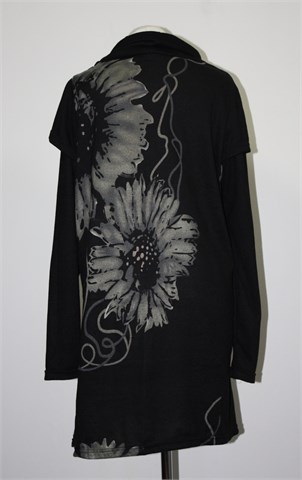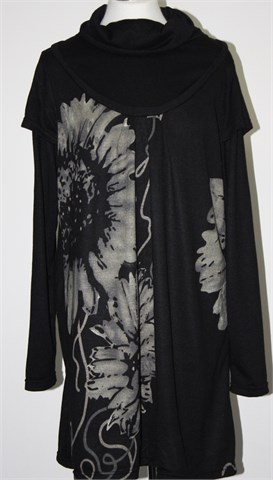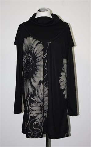 Mana tunika sa dugim rukavima crne boje sa cvjetnim uzorkom na materijalu (kao na slici). Dolčevita ovratnik, kratki rukavići na dugim rukavima (djeluje dvoslojno). Lagan i mekan materijal, rastezljiv.