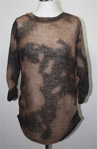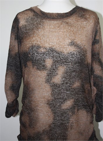 Mana lagana vesta/pulover prošarano smeđe boje, rukavi su poludugi i stegnuti gumicama. Lagana, mekana i rupičasta.
