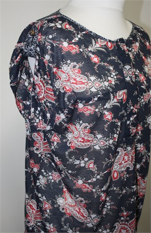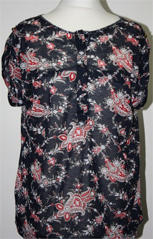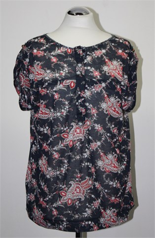 Mango Suit majica sa kratkim rukavima, tamno plave boje sa printom. Sa prednje strane gumbići, na kraju svakog rukava gumbić za dodatno skraćivanje rukava. Materijal je vrlo lagan, blago proziran i malo rastezljiv.