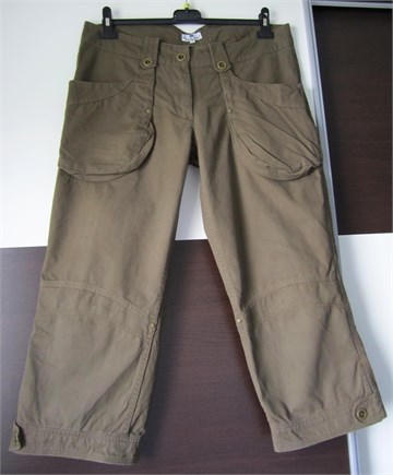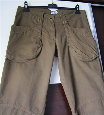 Mango Tree poluduge hlače smeđe-maslinasto zelene boje, materijal je blago rebrast. Deblji pamuk, mogu se nositi cijelu godinu. Prednji cif i gumbić, ukrasna pasica za remen. Prednji vrećasti džepovi, otraga bez džepova. Na rubovima nogavica mandžete sa gumbićem.