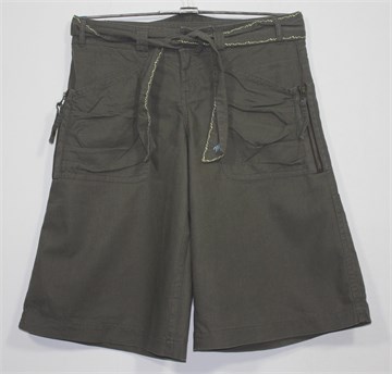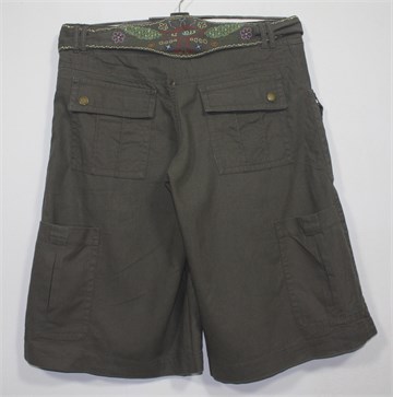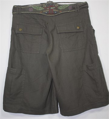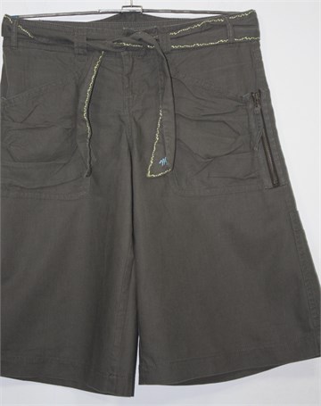Mango poluduge hlače/bermude maslinasto zelene boje, mješavina pamuka i lana. Prednji, stražnji i jedan bočni džep. Prednji cif i kopčanje, pripadajući remen od istog materijala sa našivenim aplikacijama od raznobojnog konca (može se skinuti).