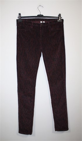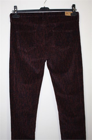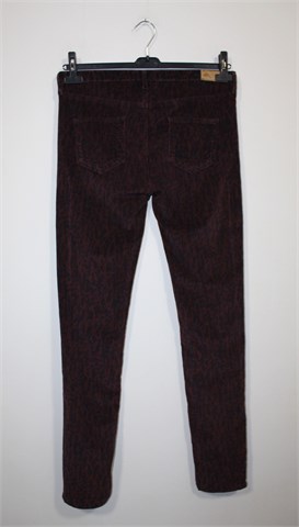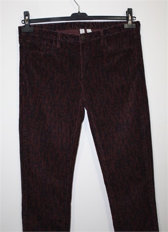 Mango hlače od tanjeg i mekanog samta neobične nijanse smeđe-ljubičaste boje (svijetla bordo boja) s uzorkom (kao na slikama). Prednji cif i kopčanje, pasica za remen. Prednji i stražnji klasični džepovi, model skinny traper hlača. Rastezljive.