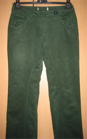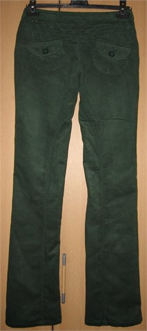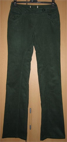 Niži struk. Prednji cif i gumbić, pasica za remen. Prednji džepovi sa ušitcima, stražnji sa gumbićima i na preklop. Ravne nogavice. Tanak i sitan samt.