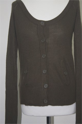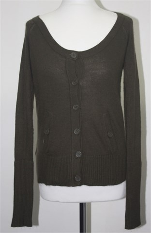 Mango kardigan/vesta sa kopčenjem tamnije maslinasto zelene boje sa prednjimi kosim džepovima sa gumbom. Jako mekano, mucasto i rastezljivo pletivo.