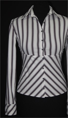 Mango košulja sa dugim rukavima, bijele boje sa prugama (crno-sivim i rozim). Prednje kopčanje, rezana ispod prsiju. Strukirana i rastezljiva.