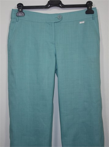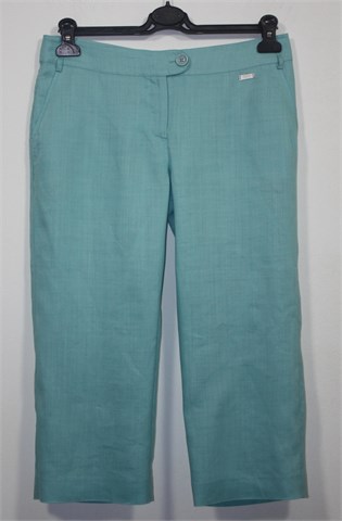 Mango poluduge hlače, lijepe tirkizno plave boje. Prednji cif i kopčanje, pasica za remen. Prednji bočni džepovi, MNG metalna značkica sa prednje strane. Materijal je 100% ramija (izgledaju kao lanene) samo je materijal puno čvršći.