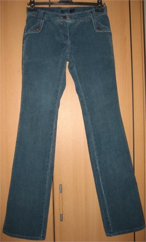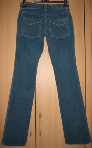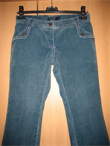 Niži struk. Prednji cif i kopčanje. Prednji bočni i stražnji džepovi sa drukerima, na preklop. Ravne nogavice. Prošivene ljubičastim koncem. Nisu rastezljive. Deblji samt.