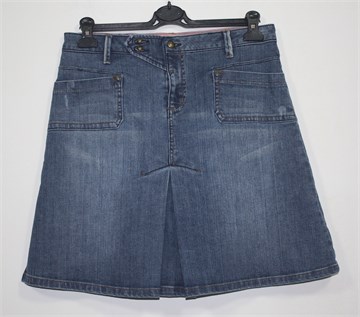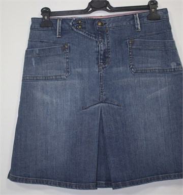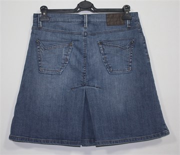 Mango suknja od trapera srednje plave boje, mjestimično ispranog i ocufanog izgleda (tvornički). Prednji cif i kopčanje, pasica za remen. Prednji i stražnji džepovi, falde sa prednje i stražnje strane (po sredini). Blago rastezljiva.