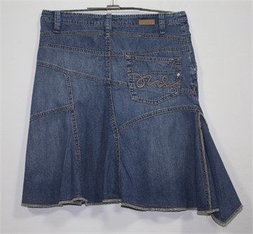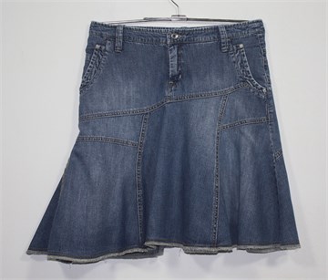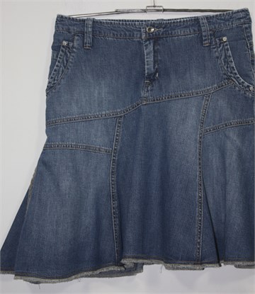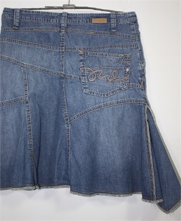 Mango suknja od trapera, mjestimično ispranog i iscufanog izgleda. Prednji cif i kopčanje, pasica za remen. Prednji bočni i jedan stražnji džep.