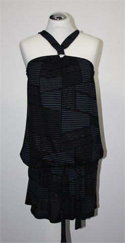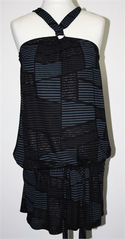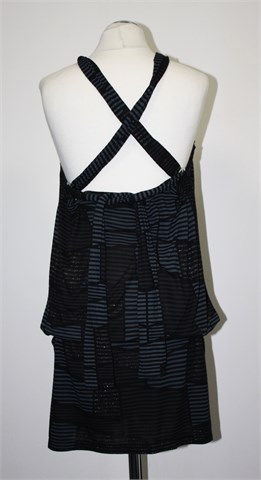 Mango kraća haljina/tunika, crne boje sivo-srebrnim prugastim uzorkom (kao na slici). Sa prednje strane trake koje se vežu na leđima (vjerojatno postoji više opcija kako zavezati te trake), ispod pazuha prošivena sa gumicama. U struku lagano stegnuta gumicom, bočne ušice za remen sa pripadajućim remenom. Lagan i rastezljiv materijal.