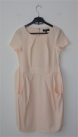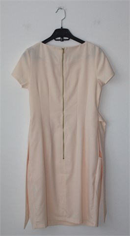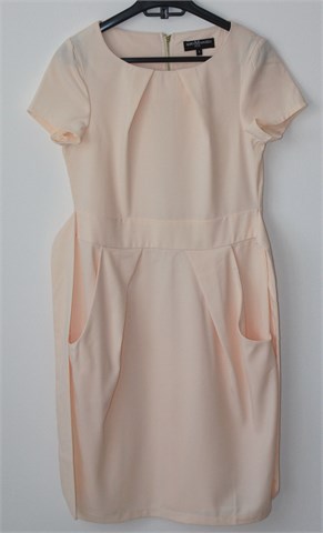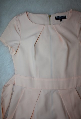 Marc Angelo haljina sa kratkim rukavima, nude-roze boje. Bočne trake za vezanje, stražnji cif. Prednji bočni džepovi, ukrasne falde. Nema podstavu (providna), nije rastezljiva.