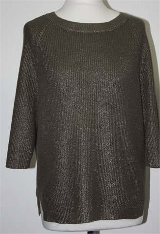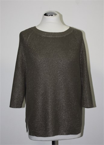 Marc Cain vesta sa poludugim rukavima, maslinaste boje sa metalik sjajem. Mali bočni prorezi, tanje i vrlo rastezljivo končano pletivo.