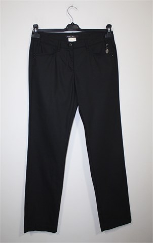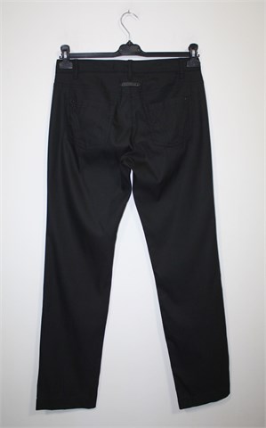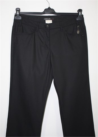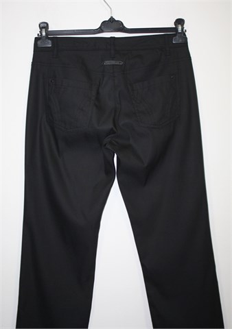 Marc Cain hlače crne boje, materijal je vrlo blago sjajan. Prednji cif i kopčanje, pasica za remen. Prednji i stražnji džepovi, blago rastezljive. MC privjesak sa prednje strane (može se skinuti), Marc Cain oznaka sa stražnje strane.