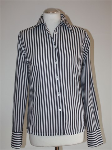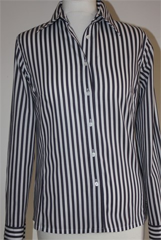 Marco Pecci košulja sa dugim rukavima, bijele boje sa tamno sivim prugama. Prednje kopčanje, blago strukirana (stražnji ušitak se malo odšio ali bez problema se zašije). Nije rastezljiva.