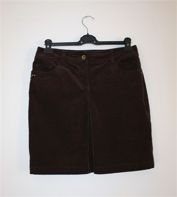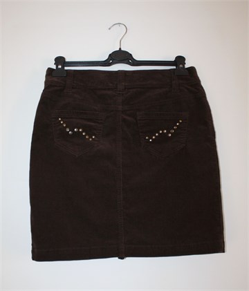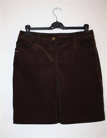 Marco Pecci suknja od samta, tamno smeđe boje. Prednji cif i kopčanje, pasica za remen. Prednji i stražnji džepovi (ukrašeni drukerima). Mekan i rastezljiv samt.