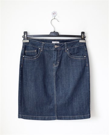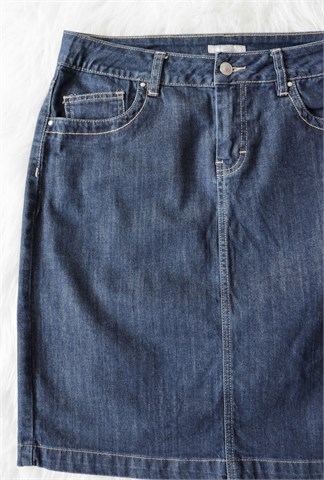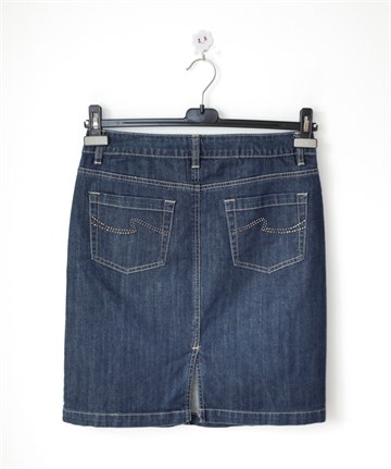 Marco Pecci traper suknja, plave boje. Prednji cif i kopčanje, pasica za remen. Prednji i stražnji džepovi (stražnji ukrašeni cirkonima/aplikacijama). Stražnji prorez, blago rastezljiva.