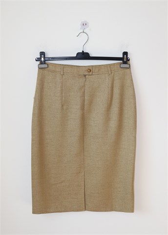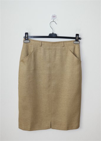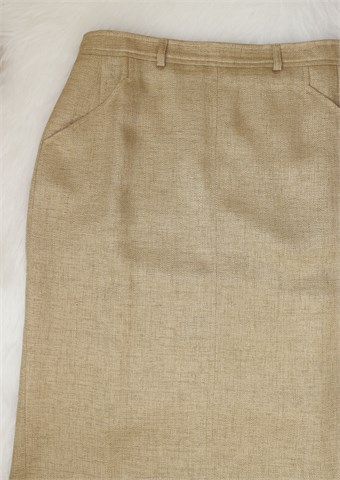 Marcona suknja zlatno-bež boje (materijal je srednje debljine, blago sjajan). Stražnji cif i gumbić, prednji džepovi i prednji i stražnji mali rasporci (po sredini suknje). Uska pasica za remen, podstavljena.