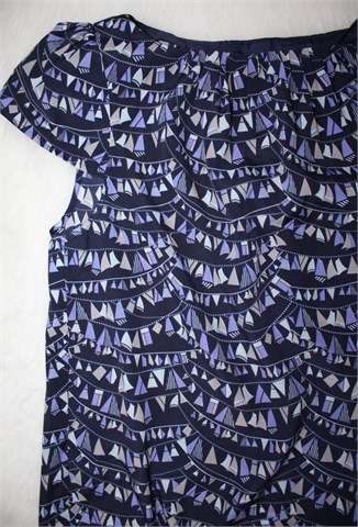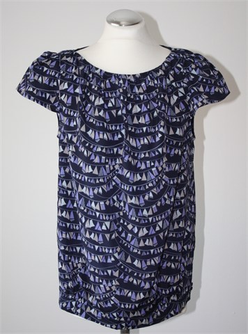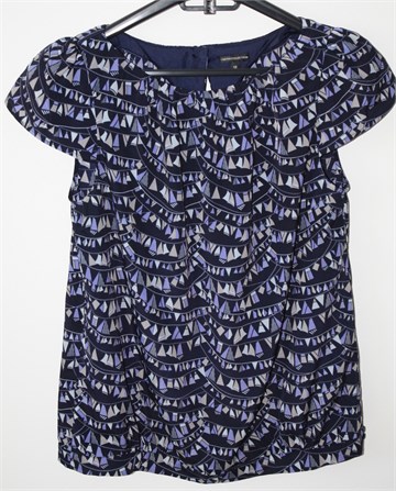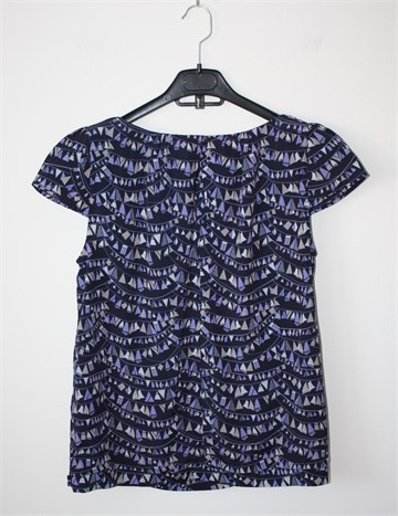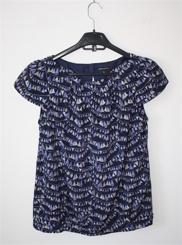 Marks & Spencer (Limited Collection) bluza sa kratkim rukavima, tamno plave boje sa printom (boje i uzorak printa vidljivi na slikama). Jastučići u ramenima, gumbić i mali otvor sa stražnje strane. Nije rastezljiva.