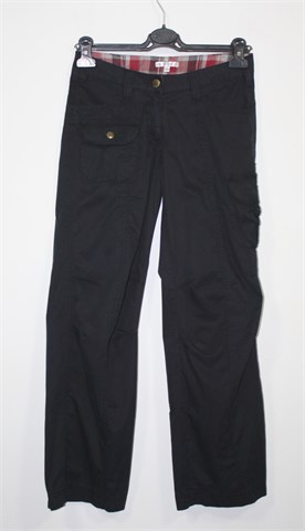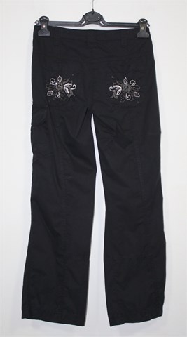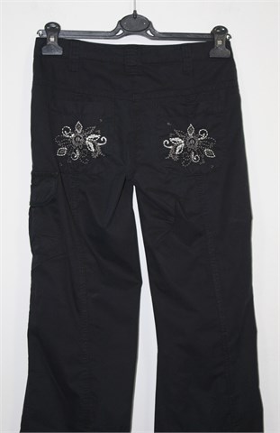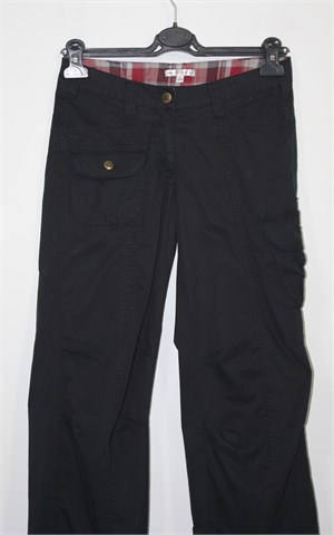 Marks & Spencer pamučne cargo hlače crne boje. Prednji cif i kopčanje, pasica za remen. Prednji i stražnji džepovi (stražnji ukrašeni aplikacijama od konca), mali džepovi sa prednje strane i na bedru. Sa unutarnje strane pasice gumice sa gumbom za regulaciju širine. Tanji i lagan pamuk, nerastezljiv.