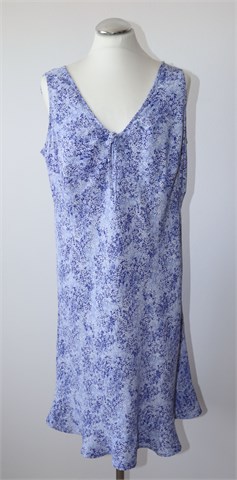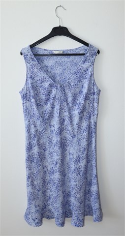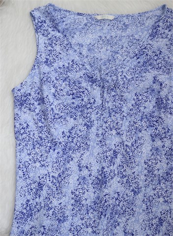Marks & Spencer haljina bez rukava, svijetlo plave boje sa tamnije plavim i bijelim cvjetnim printom (boje i uzorak vidljivi na slikama). Mali volančić na dnu haljine. Lagan i blago rastezljiv materijal.