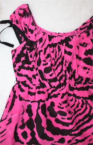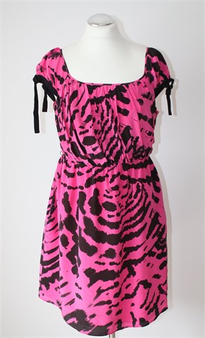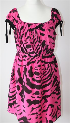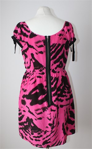 Marks & Spencer Limited Collection haljina ciklama roze boje sa crnim printom (uzorak printa vidljiv na slikama). Kratki rukavi (vezanje na krajevima rukava), rezana ispod prsiju, prednji bočni džepovi. Stražnji cif, podstavljena. Tanja i lagana, male bočne ušice za remen. Oznaka boje na etiketi - pink mix (uživo ciklama roza boja).