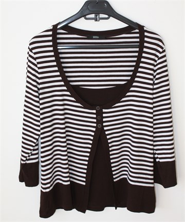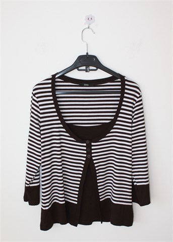 Marks & Spencer majica sa poludugim rukavima, bijelo-smeđe boje. Sa prednje strane majica je dvoslojna (izgleda kao da je topić ispod majice). Mekana i rastezljiva.