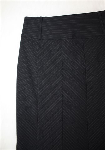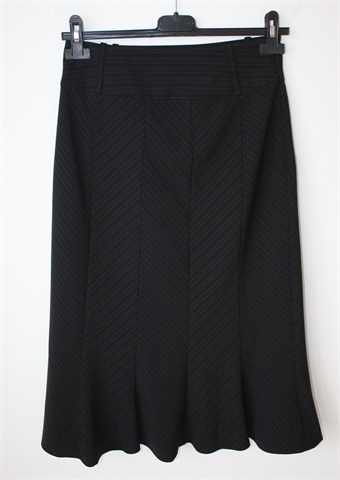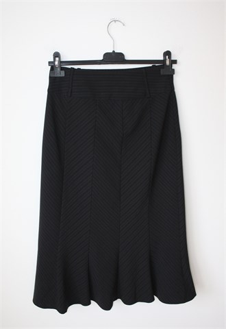 Marks & Spencer suknja midi dužine, crne boje sa prugastim uzorkom (vidljivo na slikama). Bočni cif i gumbić, tanka pasica za remen. Podstavljena, rastezljiva (osim pasice).
