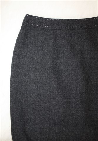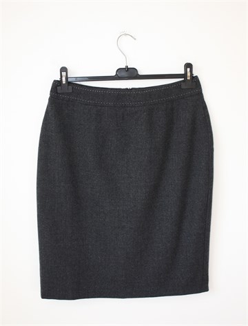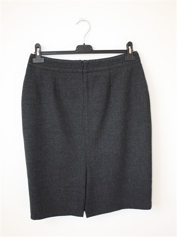 Marks & Spencer suknja klasičnog kroja, prošarano sive boje. Stražnji cif i gumbić, rasporak na sredini suknje (stražnja strana). Topli vunasti štof (nije debel), podstavljen. Blago rastezljiva, ukrasni proštep od konca na pasici.