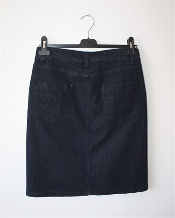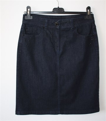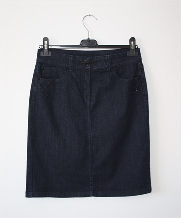 Marks & Spencer traper suknja tamnije plave boje. Prednji cif i kopčanje, pasica za remen. Prednji i stražnji klasični džepovi, rubovi džepova ukrašeni su prošivima od konca i crnim aplikacijama. Malo rastezljiva.