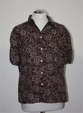 Masego košulja sa kratkim rukavima, smeđe boje sa bijelim printom. Prednje kopčanje, ukrasni prošivi sa prednje strane. Blago strukirana, tanji i lagan pamuk.