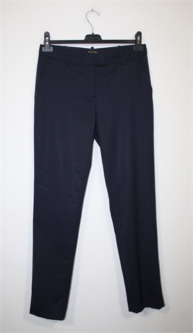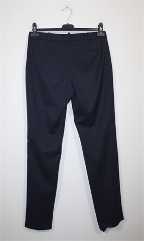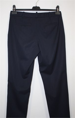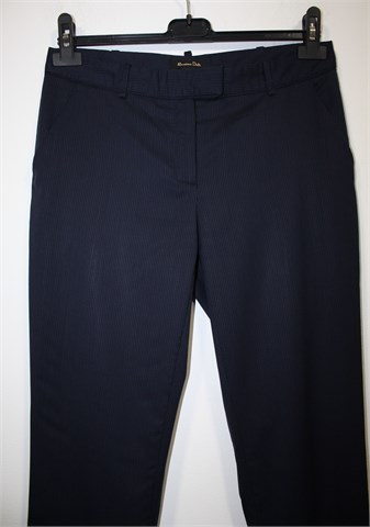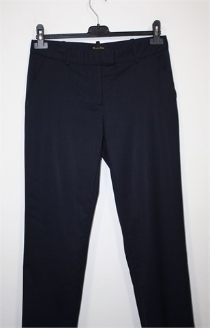 Massimo Dutti hlače od tankog i laganog vunastog štofa, tamno plave boje sa svijetlo plavim diskretnim prugtama. Prednji cif i kopčanje, uska pasica za remen. Prednji bočni, stražnji ukrasni/lažni džepovi. Odličan, klasičan model.