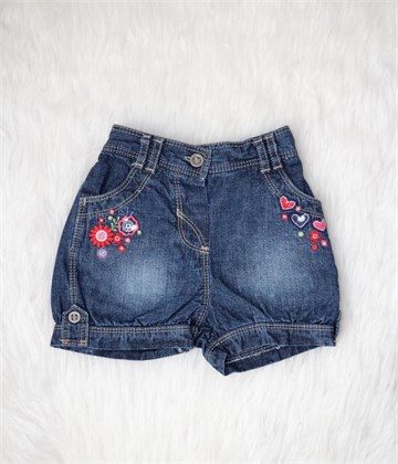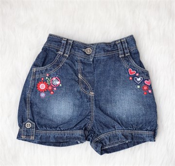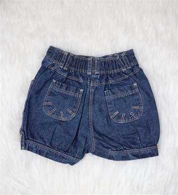 Matalan kratke hlačice od trapera, plave boje. Prednji i stražnji džepovi (prednji ukrašeni aplikacijama od konca). Stražnja strana pasice je rastezljiva pa je širina prilagodljiva (vidjeti mjere).