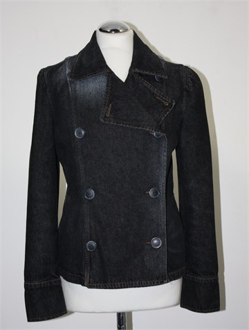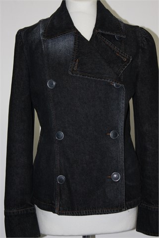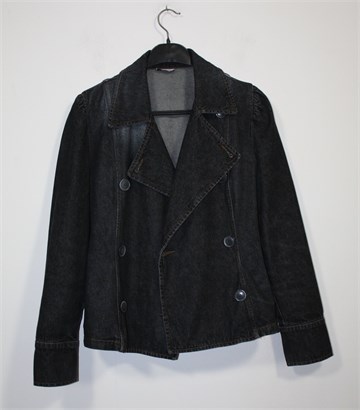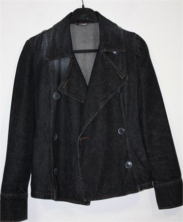 Max & Co traper jakna tamno sive boje, mjestimično ispranog i izlizanog izgleda. Prednje kopčanje (unutarnji gumbić se malo odšio), bočni džepovi. Gumbići na krajevima rukava (jedan nedostaje, trebala bi biti dva na svakom rukavu), blago strukirana. Čvrst i nerastezljiv traper.