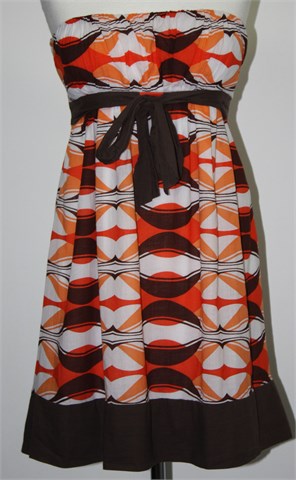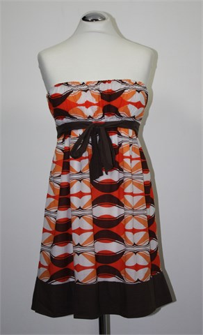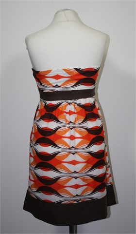Max Rave haljina/tunika bez naramenica, bijele boje sa pomalo retro printom (boje i uzorci kao na slici). Spužvasto podstavljena u dijelu iznad prsiju (ne mora se se nositi grudnjak), trake za vezanje ispod prsiju. U sami gornji rub je ušivena gumica pa je širina prilagodljiva. Bočni cif (malo je cif zahvatio materijal pri dnu pa je ostalo sitno oštećenje), podstavljena. Lagana i prozračna.
