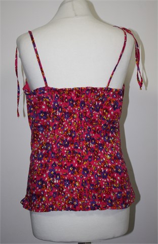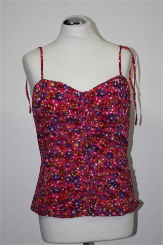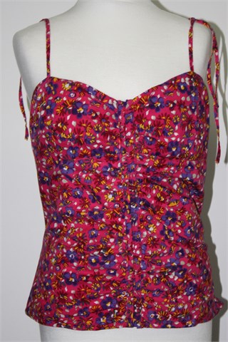 Max Rave topić (krojen kao korzet) ciklama roze boje sa šarenim cvjetnim printom. Naramenice se vežu na željenu dužinu, sa stražnje strane prošivena sa gumicama (rastezljiva i prilagodljiva širina). Pojačanje na prsima (ušiveni jastučići) pa se ne mora nositi grudnjak, sa prednje strane dvije bočne plastične žice (ušivene) pa topić odlično stoji. Podstavljen (podstava je bočno na šavu malo rastegnuta ali ne smeta kod nošenja).
