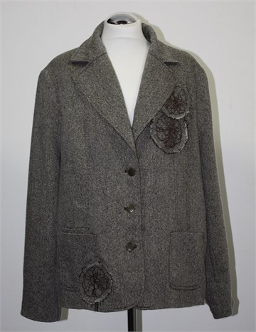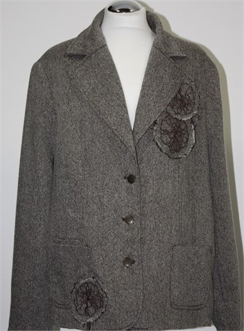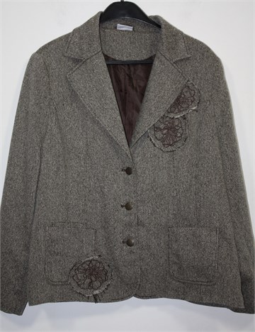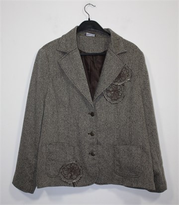 Maxi Blue sako/kaputić prošarano smeđe-bež boje. Prednje kopčanje, bočni džepovi. Sa prednje strane našiveni prišivci sa cvjetnim aplikacijama od konca (ocufani rubovi). Jastučići u ramenima (ušiveni), podstavljen. Materijal je deblji štof/tvid.