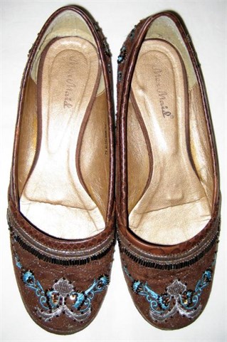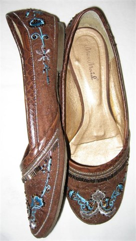 Umjetni materijali izvana i iznutra. Vanjski dio umjetna brušena koža sa našivenim perlicama u tirkiznoj, smeđoj i zlatnoj boji. Manji broj 40.