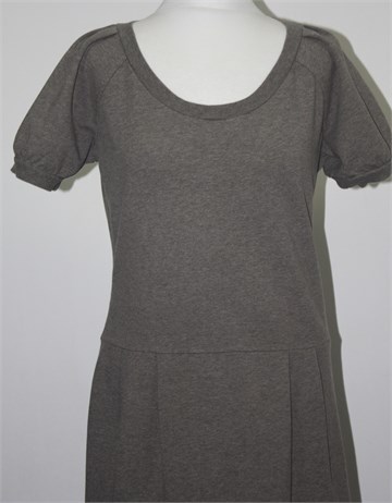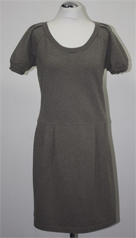 Mexx haljina sa kratkim rukavima, boja je prošarano sivo-smeđa. Materijal je kao za trenirke, lagan i većinom pamučan (sa dodatkom elastina). Oko dekoltea i na krajevima rukava stegnuta pasicom. Rezana u struku, ispod "reza" sa prednje strane faldice. Faldice i na rukavićima. Materijal je deblji ali mekan, blago rastezljiv.