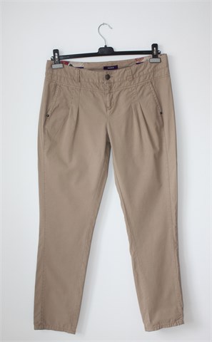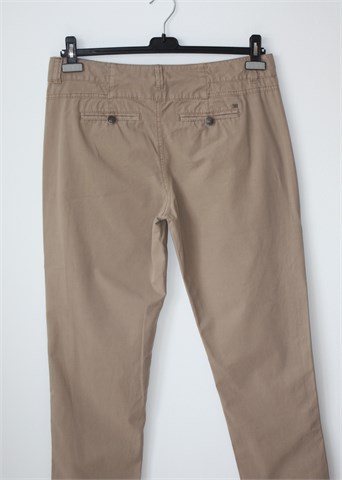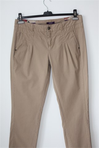 Mexx hlače bež/svijetlo smeđe boje sa blago ispranim izgledom, casual kroja. Prednji cif i kopčanje, pasica za remen. Prednji i stražnji džepovi (stražnji skriveni sa gumbom). Prednji ušitci, šire u gornjem dijelu (vidjeti mjere). Nisu rastezljive.