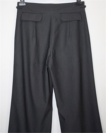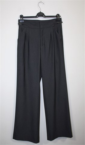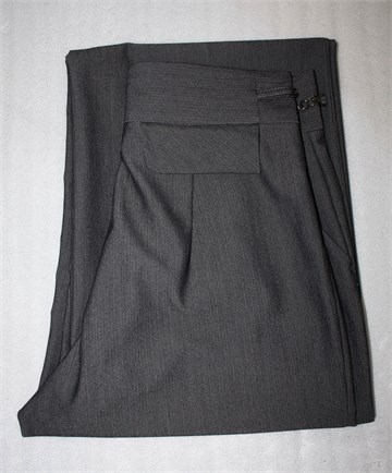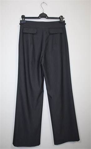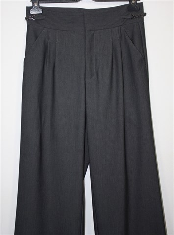 Mexx hlače klasičnog kroja sa širim nogavicama i višljim strukom (dublji model), sive boje sa diskretnim prugastim uzorkom. Prednji cif i kopčanje sa kopčicama i gumbićima (jedan se odšio ali može se zašiti bilo kakav), ukrasni bočni remenčići-lančići na pasici. Prednji bočni, stražnji ukrasni preklop-džepovi. Šire nogavice, lagan materijal. Blago rastezljive.